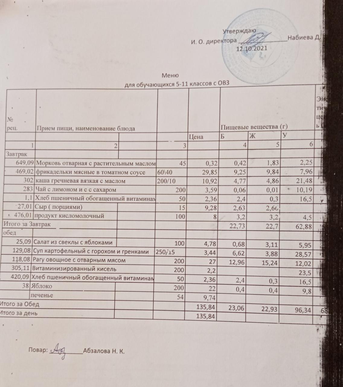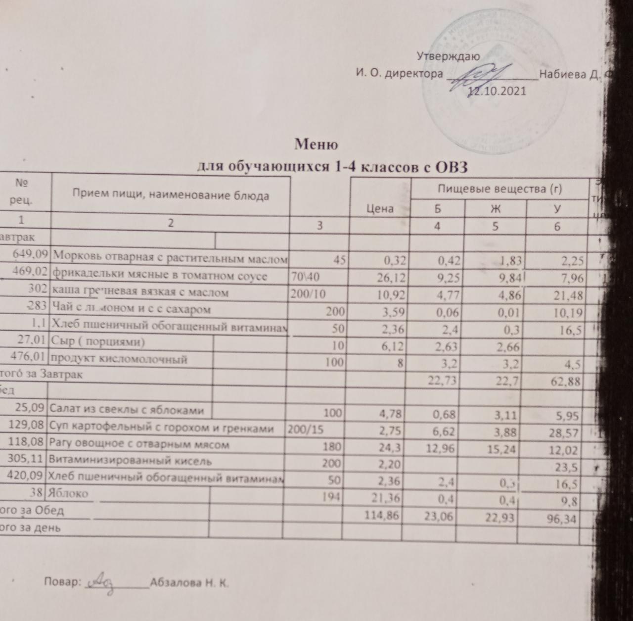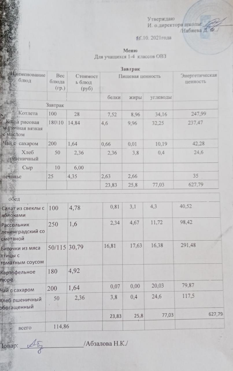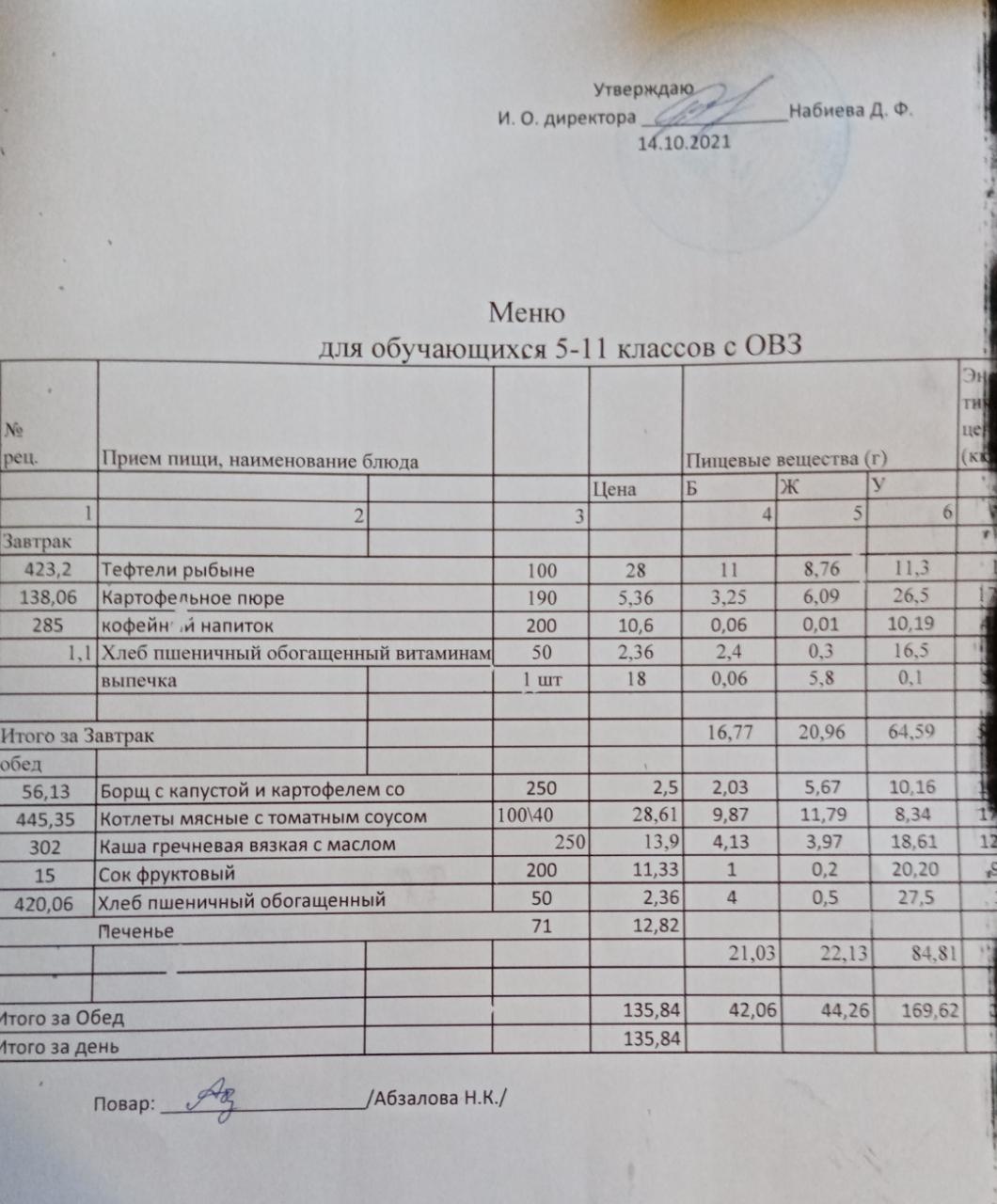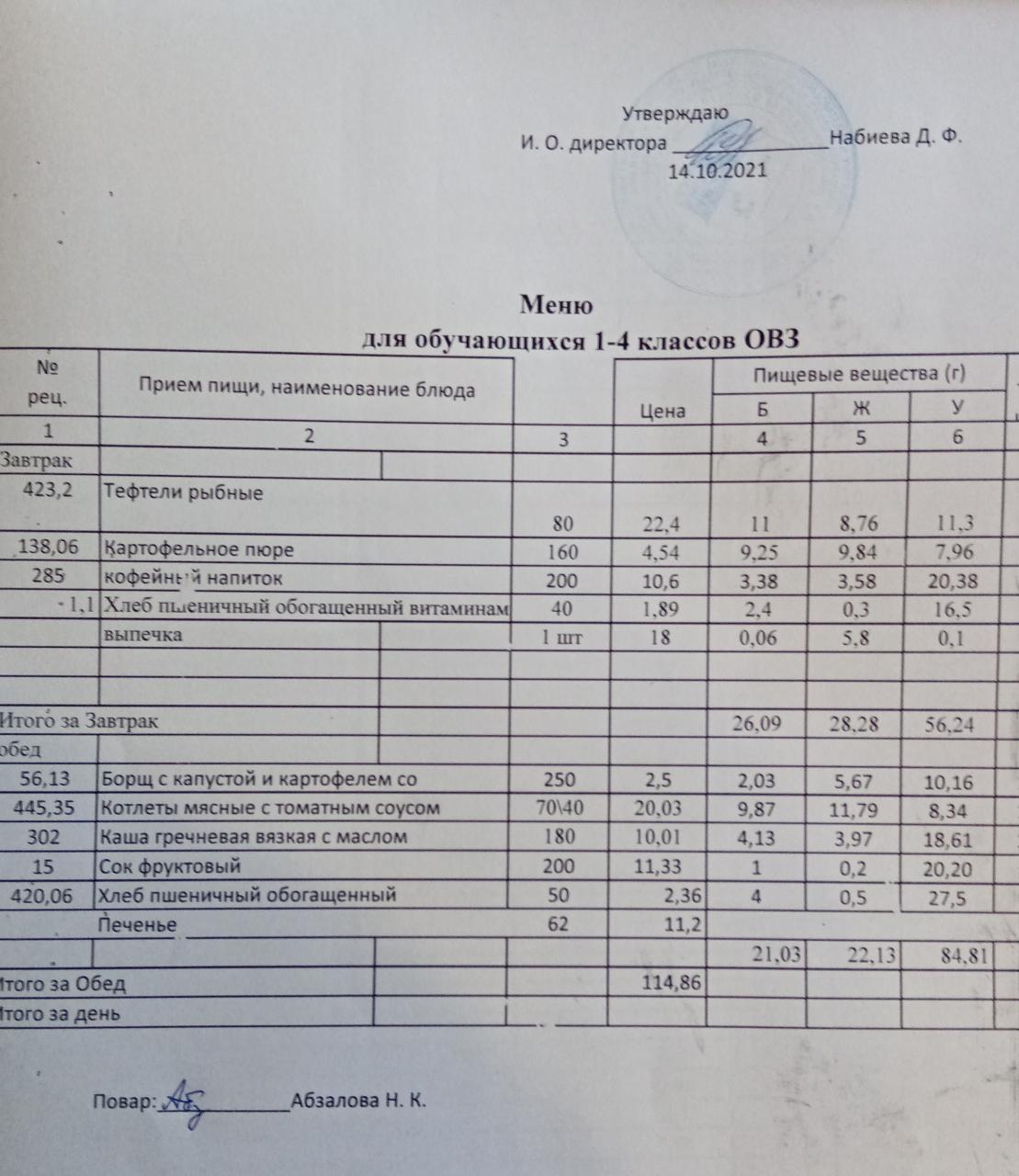 Меню на 14.10. для учащихся 5-11 в ОВЗ