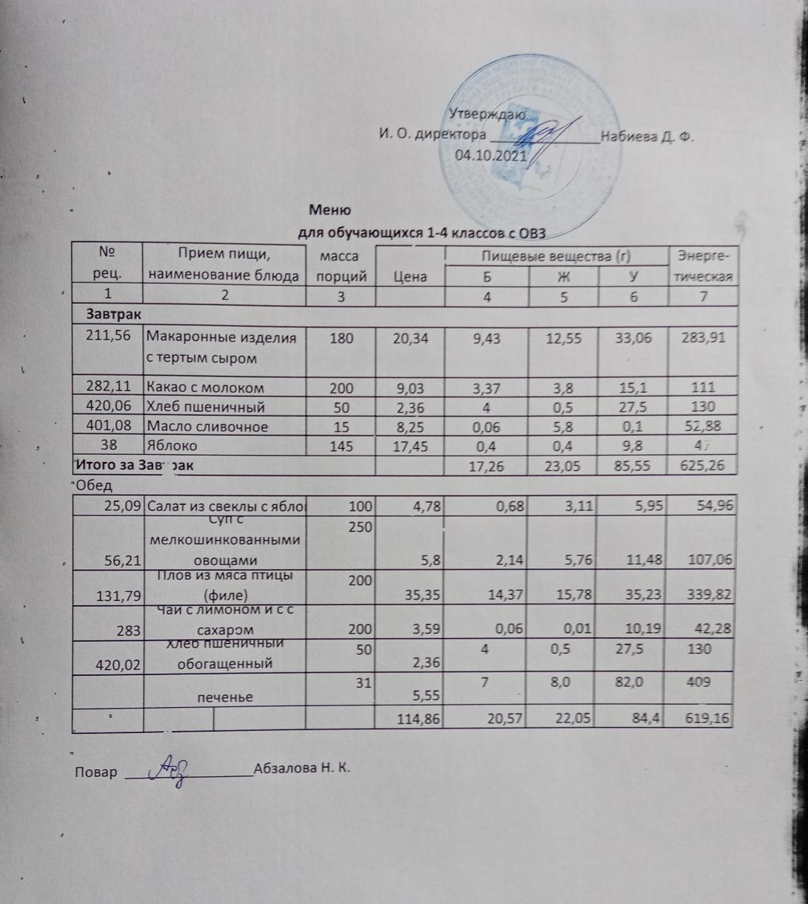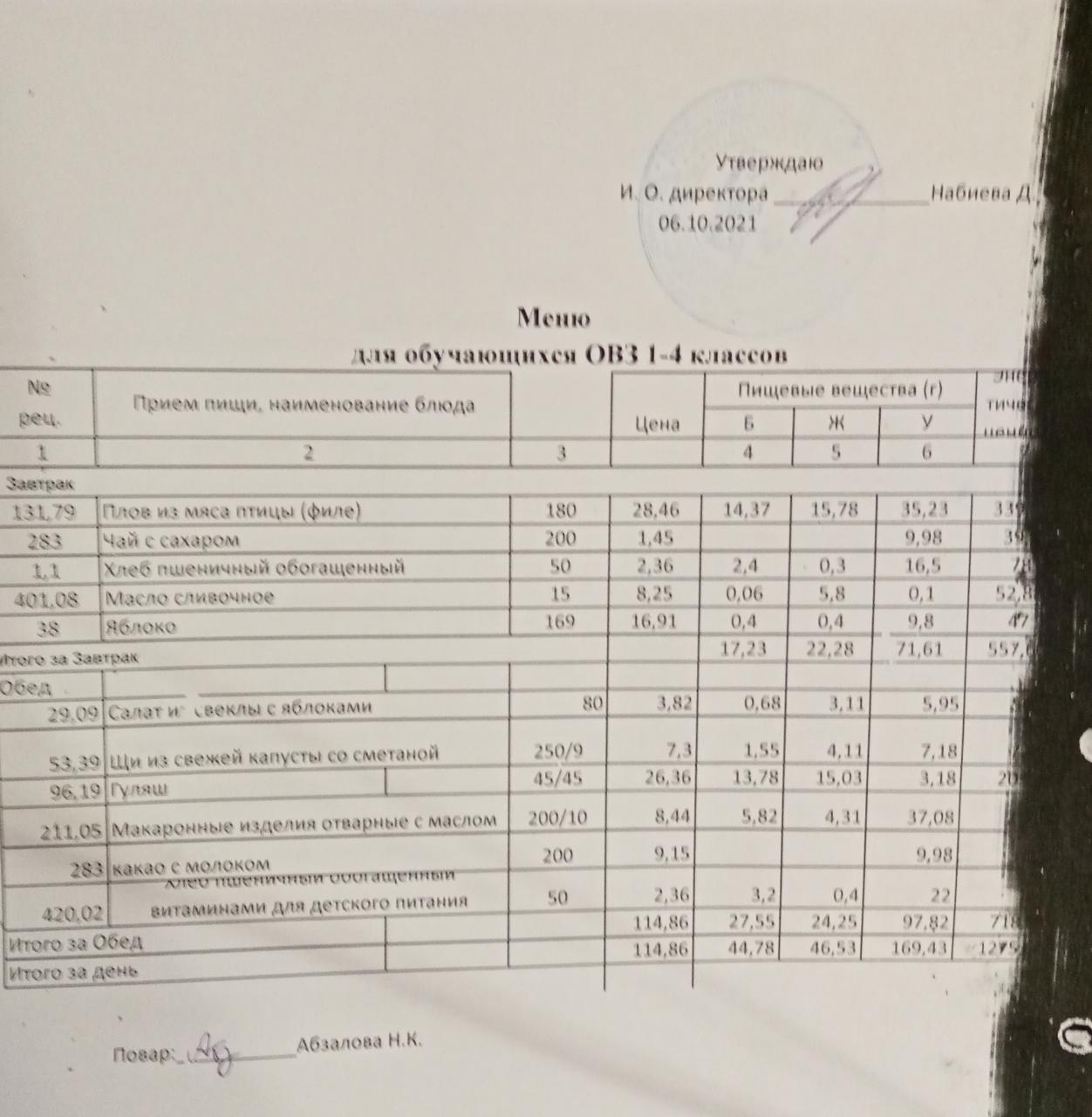 Меню на 04.10. для учащихся 1 - 4 классов с ОВЗ