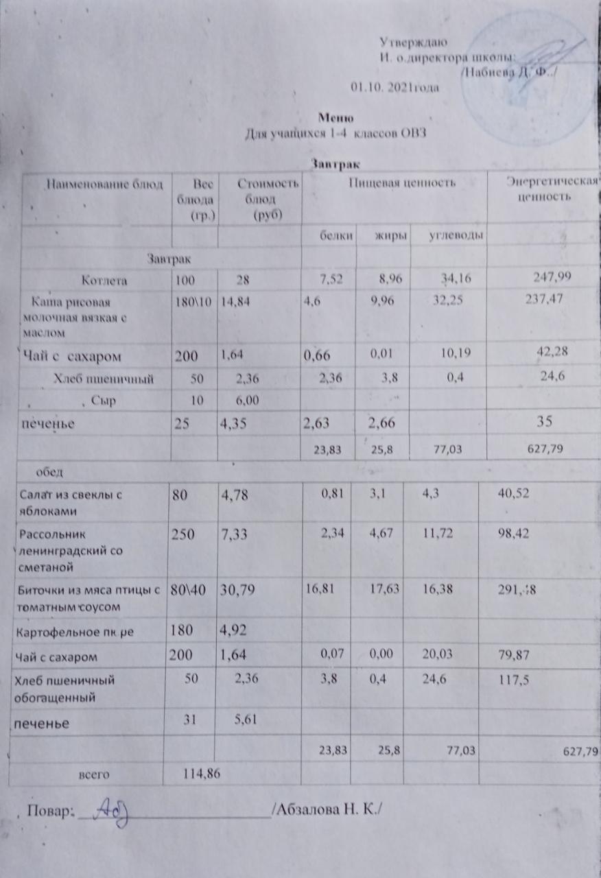 Меню на 01.10 для учащихся 1-4 кл с ОВЗ