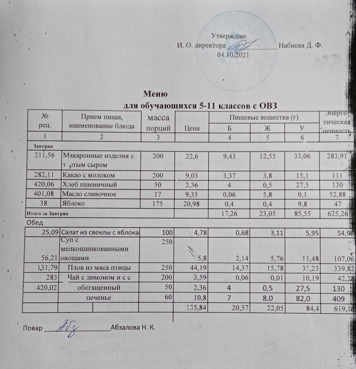 Меню на 04.10. для учащихся 5-11 кл с ОВЗ