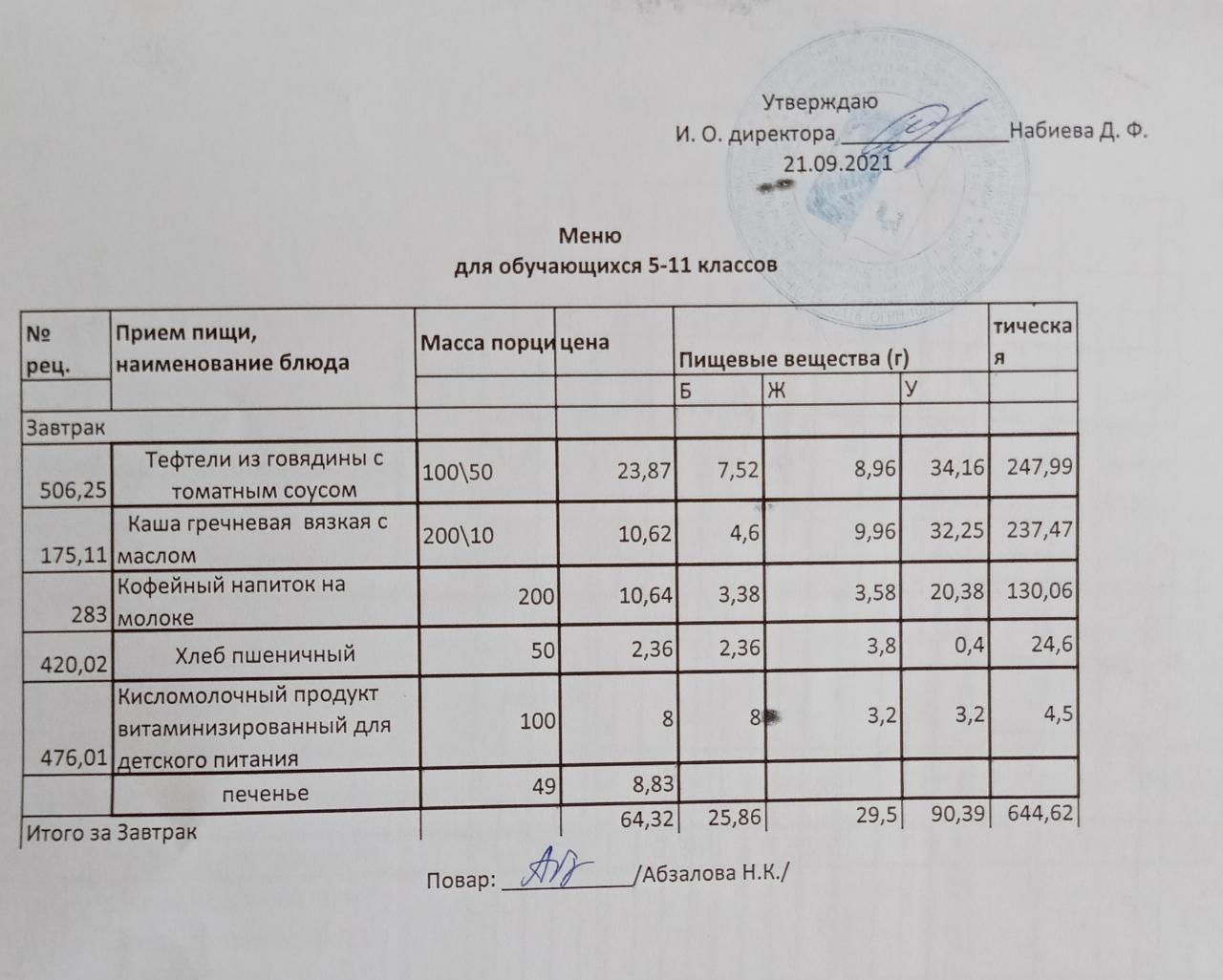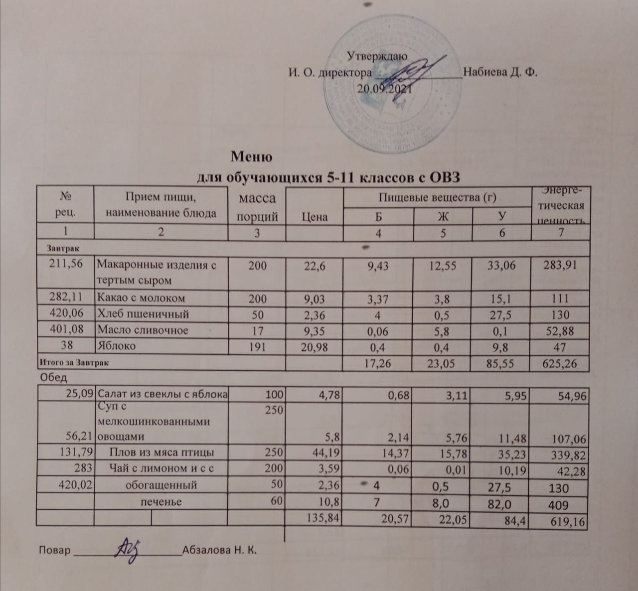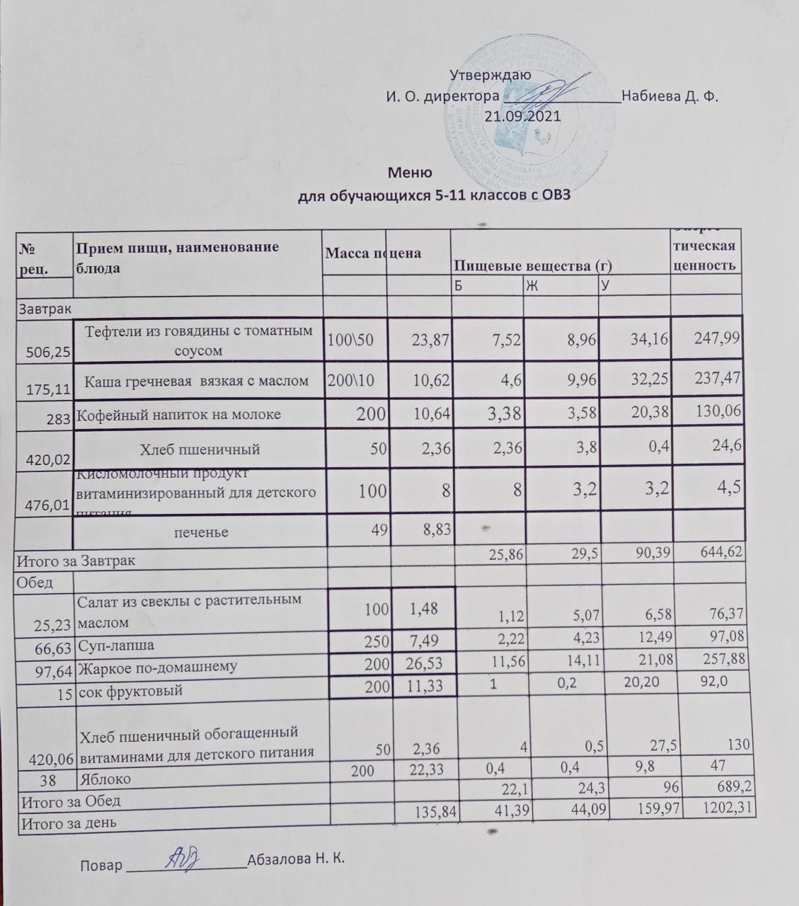 Меню на 21.09. для учащихся 5-1 кл с ОВЗ
