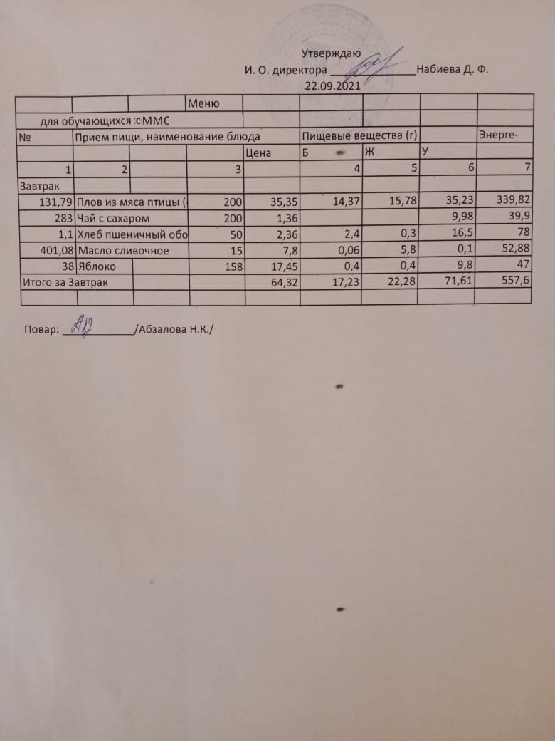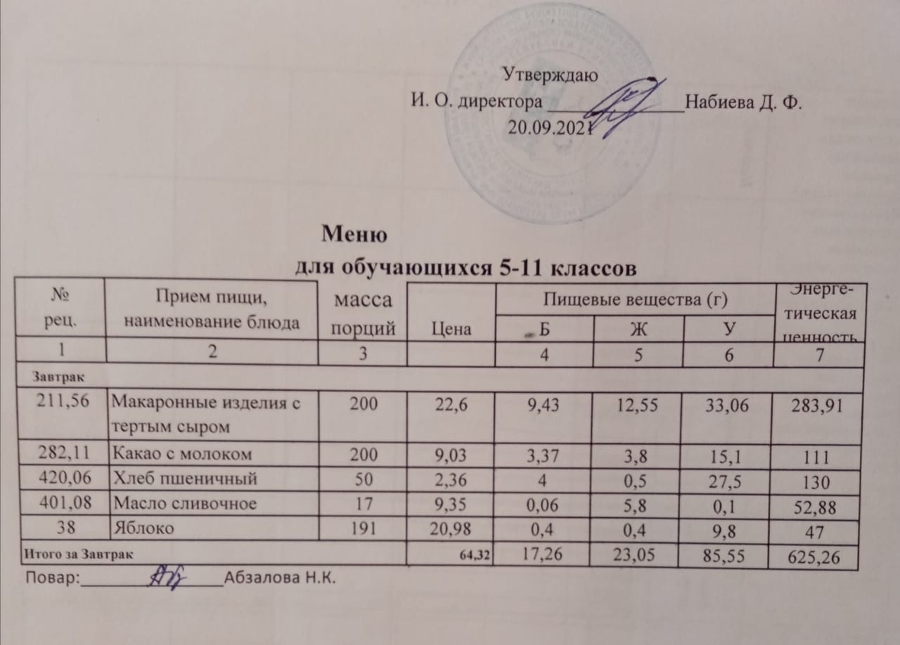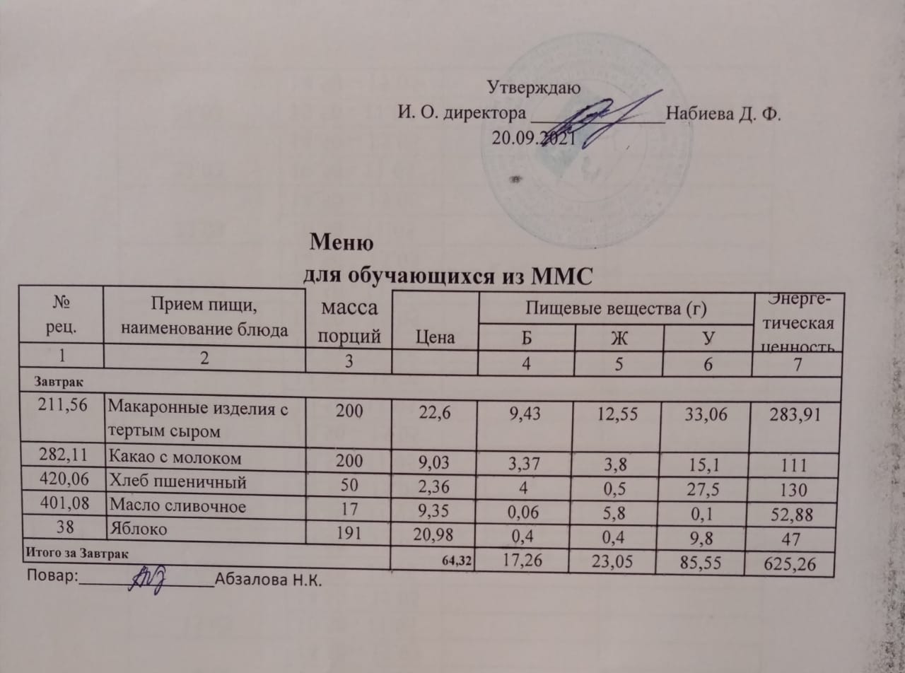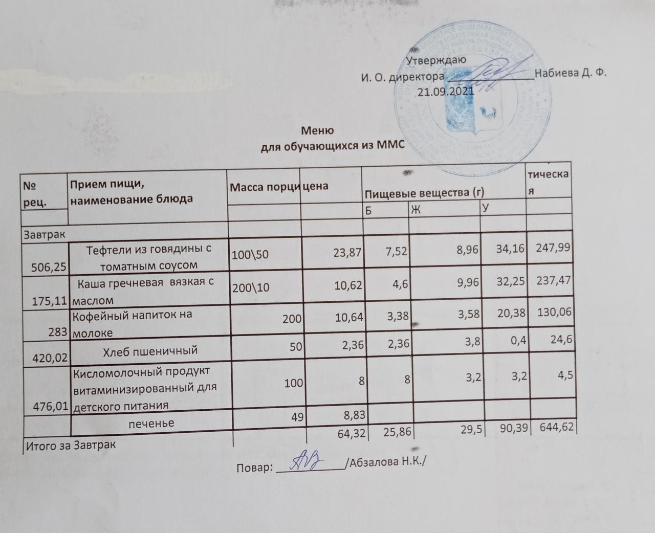 Меню на 21.09. для учащихся 5-1 кл с ОВЗ