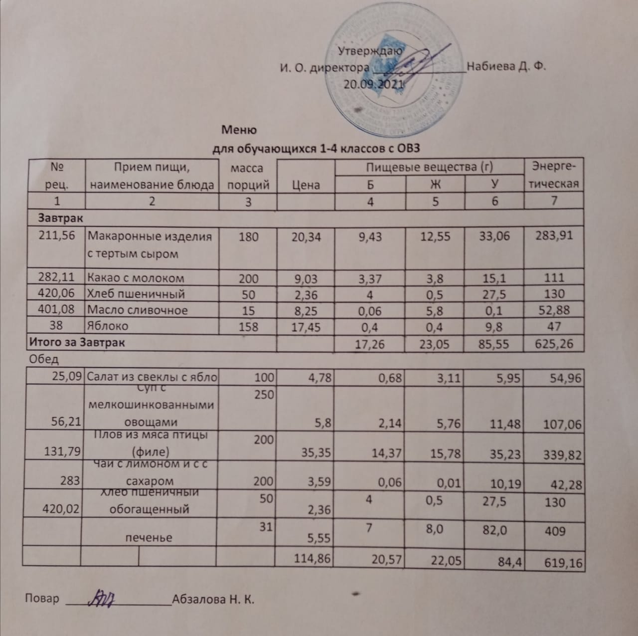 Меню на 21.09. для учащихся 1-4 кл. с ОВЗ