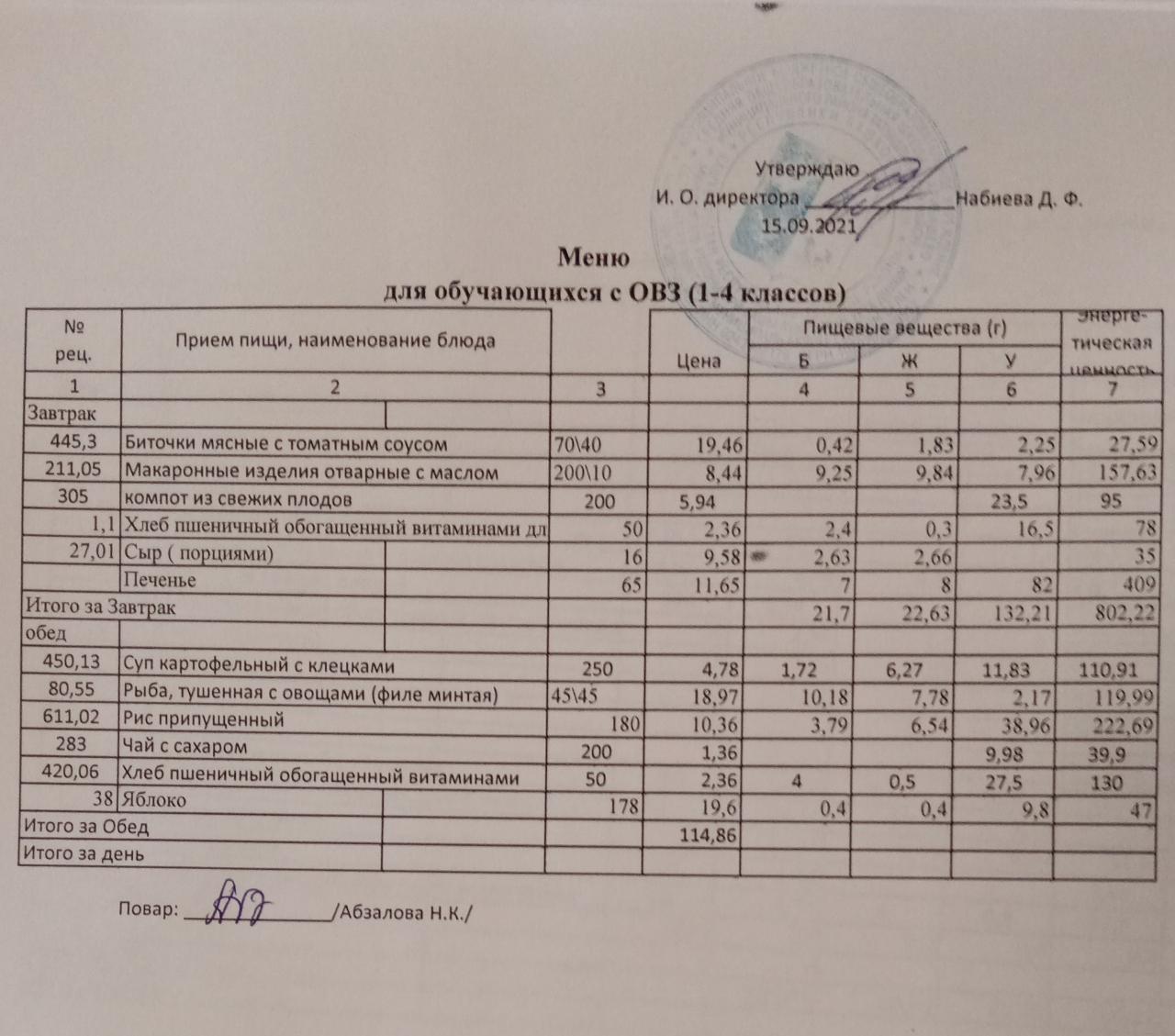 Меню на 15.09. для учащихся 1 - 4 кл с ОВЗ
