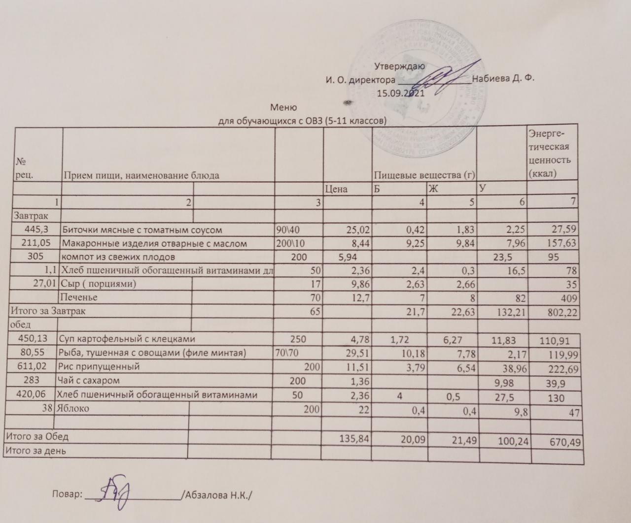 Меню на 15.09. для учащихся 5-11 кл. с ОВЗ