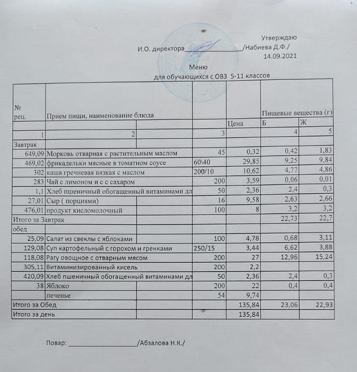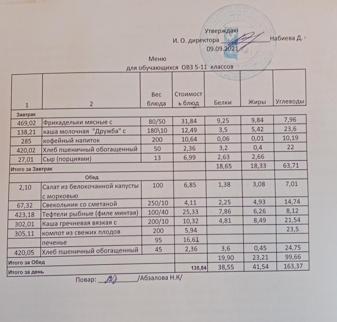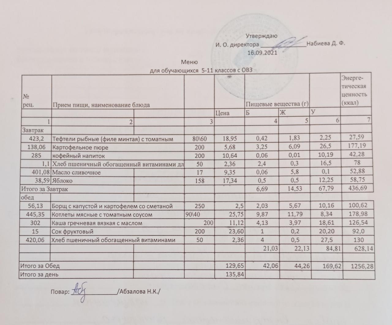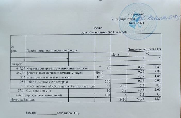 Меню на 16.09. для учащихся 5 - 11 классов с ОВЗ