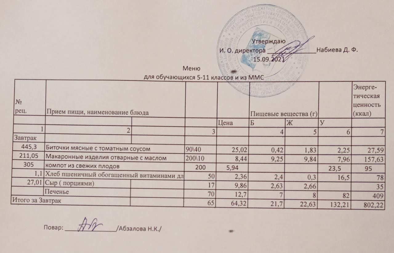 Меню на 15.09. для учащихся 5 - 11 кл и ММС