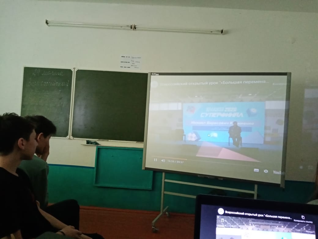 24 марта 2022 года обучающиеся 6-11 классов присоединились к Всероссийскому Открытому уроку «Большая перемена — время возможностей». Эфир был посвящён Всероссийскому конкурсу «Большая перемена». Открытый урок провела София Хоменко вместе Егором Баткиным, победителем Всероссийского конкурса прошлых лет. Гостями эфира стали: Сергей Кравцов, Министр просвещения Российской Федерации, Наталия Мандрова, генеральный директор АНО «Большая перемена», Юлия Ужакина, генеральный директор Корпоративной Академии Росатома. Участники прошлых лет поделились эмоциями и вспомнили самые яркие моменты конкурса. Эксперты и наставники рассказали о правилах проекта и возможностях конкурса.
