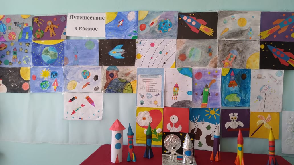 12 апреля в фойе первого этажа школы была оформлена выставка рисунков и поделок, посвящённая Дню космонавтики. Руководил процессом учитель начальных классов Гараева К.А. На выставке были представлены работы детей о космосе, звёздах и полете человека в космос. В работах детей космические просторы, галактики, планеты и звезды превратились из фантастической реальности в реальность нашего мира. Работы получились очень яркие, экспрессивные и по цвету и по форме.