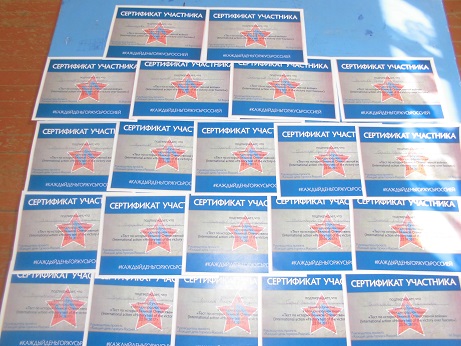 22.04.2017 г. учащиеся 8, 11 классов под руководством учителя истории Мардамшина Р.А. приняли участие в Международной акции "Тест истории Великой Отечественной войны". 15.05.2017 г. на общешкольной линейке участникам акции в количестве 21 человек были вручены сертификаты.