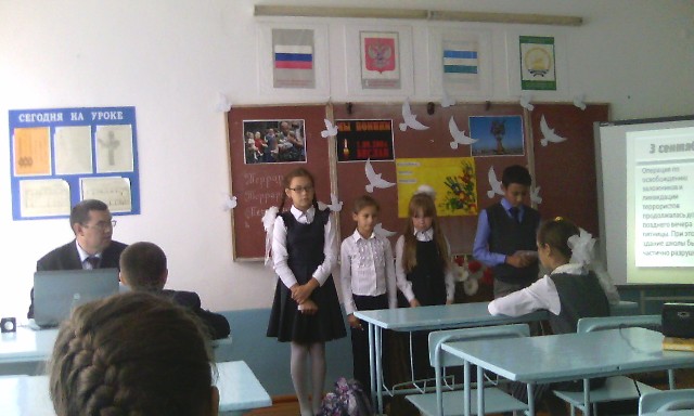 03.09.2017 г. в школе были проведены классные часы, уроки памяти и мужества с минутой молчания, просмотром видеороликов и презентации в рамках Дня солидарности в борьбе с терроризмом. Ребята вспоминали жертв террористических актов из числа гражданского населения, а также сотрудников спецслужб и правоохранительных органов, погибших при выполнении служебного долга. Учащиеся начальных классов оформили выставку рисунков с написанием пожеланий мира и добра, против насилия и террора. При организации мероприятий были использованы материалы Интернет-портала Наука и образование против террора «nac.gov.ru» и Интернет-портала Наука и образование против террора «skienceport.ru», сборник типовых сценариев проведения комплекса общественно-политических мероприятий, а также письмо антитеррористической комиссии РБ.