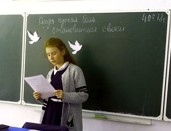 Маленьким жителям Беслана, чьи имена останутся в памяти человечества, их учителям, наставникам, до последней минуты сердцем прикрывавшим своих питомцев и разделявшим тяжесть выпавших на их долю испытаний, несгибаемым отцам и матерям Беслана, всем кто погиб в темном пекле пылающего ада и кто выжил в эти страшные сентябрьские дни, посвятили классные часы и беседы классные руководители 1 — 10 классов. Трагедия, произошедшая 1сентября 2004 г. в Беслане, потрясла весь мир. На фоне трогательной музыки ученики читали стихотворения и говорили о том, что от позорных пуль террористов в спину погибли невинные дети. Это случилось в праздничный день в священном месте — школе. Под звуки метронома почтили память всех погибших минутой молчания. В знак скорби были вывешены картинки с изображением белых голубей.