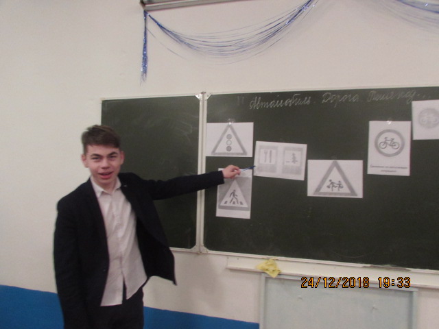 24.12.2018 г. учащимися 10 класса под руководством учителя Шамсияровой Л.Р. была проведена акция "Засветись". В рамках акции была проведена беседа " Автомобиль. Дорога. Пешеход", где дети повторили знаки дорожного движения, участвовали в онлайн-тестировании, отвечая на билеты по ПДД.