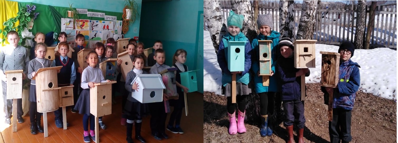 На весенних каникулах учащиеся 1 — 3 классов со своими родителями изготовили и вывесили скворечники в школьном дворе и в своих личных подворьях. Акция с участием 27 учеников начальных классов была организована учителями начальных классов.