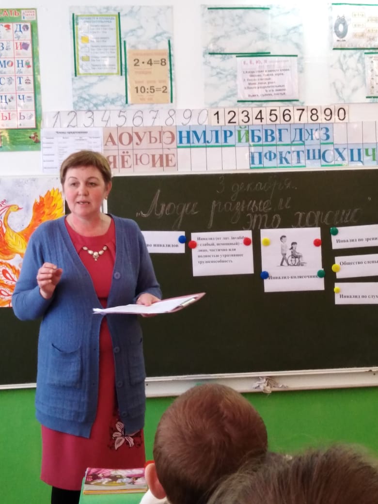 3 декабря 2019 г. в 4 классе учителем начальных классов Воробьевой Т.И. был проведен открытый классный час по формированию толерантного отношению к инвалидам. Татьяна Ильинична говорила с детьми о людях с ограниченными возможностями, инвалидах, о том, как им трудно жить в нашем мире. Обучающиеся отвечали на вопрос: какие опасности подстерегают нас в быту, о правилах безопасного поведения. Школьники принимали активное участие в выполнении практических упражнений, на которых многие ощутили на себе, как трудно быть инвалидом и как необходима им наша помощь.