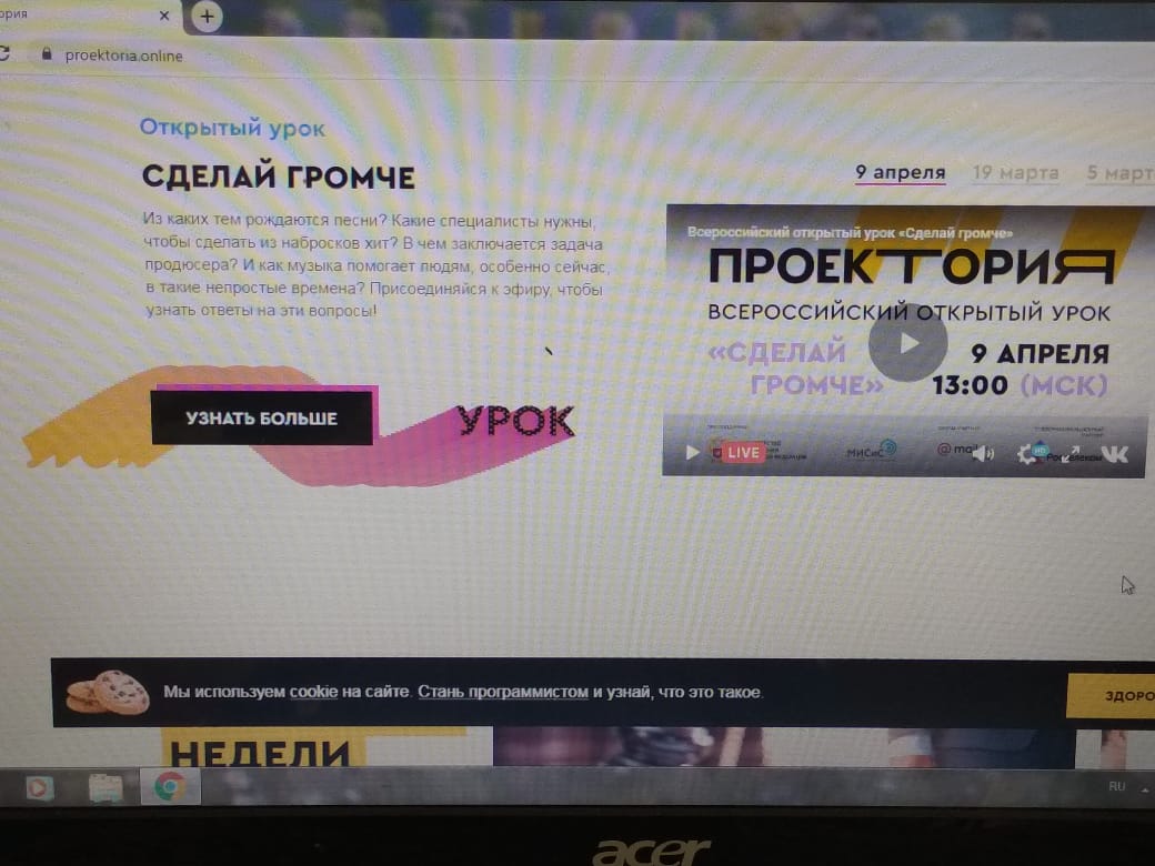 9 апреля на портале «ПроеКТОриЯ» состоялся Всероссийский открытый урок «Сделай громче». Обучающиеся МБОУ СОШ с.Арибашево, находясь дома, с удовольствием посмотрели урок в режиме онлайн. В ходе урока обсуждались вопросы: «Из каких тем рождаются песни?», «Какие специалисты нужны, чтобы сделать из набросков хит?», «В чем заключается задача продюсера?», «Как музыка помогает людям, особенно сейчас, в такие непростые времена?».
