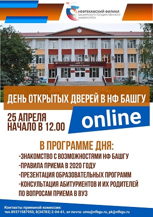 Нефтекамский филиал БашГУ 25 апреля в 12.00 ч. проводит День открытых дверей для абитуриентов и их родителей в онлайн-формате. В режиме реального времени участникам расскажут о возможностях НФ БашГУ, особенностях обучения и студенческой жизни, проконсультируют по правилам приёма и вопросам поступления в вуз.