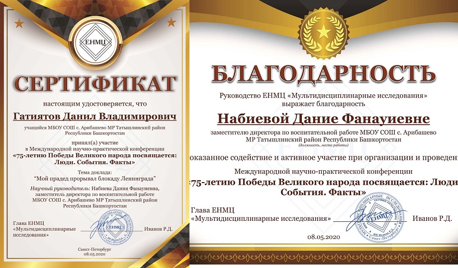 Учащийся 6 класса Гатиятов Д. под руководством учителя Набиевой Д.Ф. участвовал в Международной научно-практической конференции "75-летию Победы Великого народа посвящается: Люди. События. Факты", организованным Евразийским научно-методическим цетром "Мультидисциплинарные исследования". Его творческо-исследовательская работа "Мой прадед прорывал блокаду Ленинграда размещена на официальном сайте ЕНМЦ https://multires.ru/wp-content/uploads/KM-8_Sbornik.pdf на страницах 34 — 37.