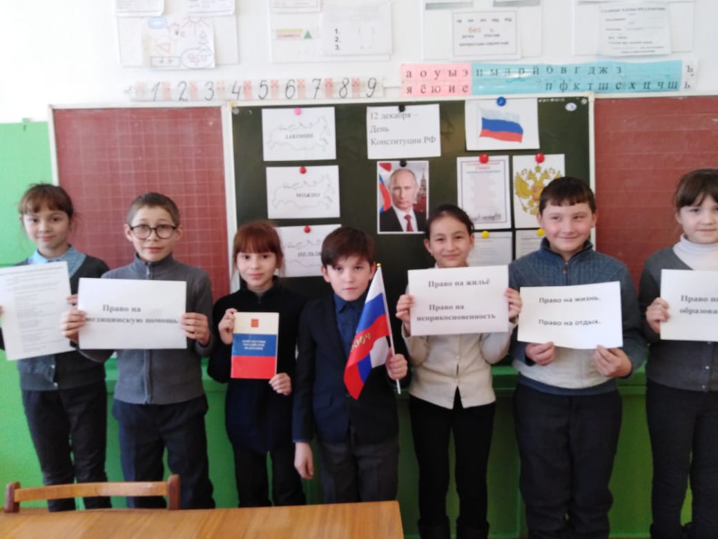 Учащиеся начальных классов вспомнили о правах ребёнка, о долге каждого гражданина и посмотрели презентацию, которая познакомила младших школьников с Государственным праздником Днем Конституции РФ. Ребята прослушали Гимн России.