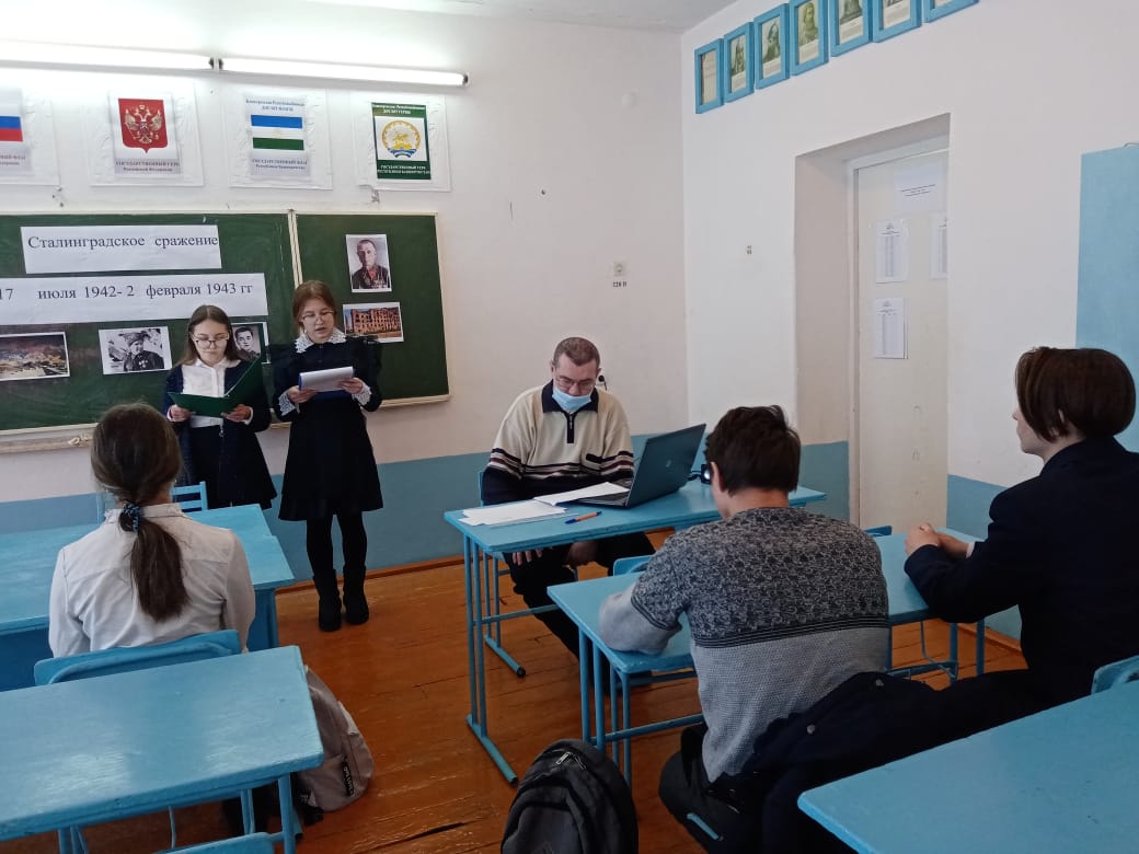 В 1942 году у стен Сталинграда решалась судьба всего цивилизованного мира. 200 дней и ночей – с 17 июля 1942 года до 2 февраля 1943 года – продолжалась Сталинградская битва при непрерывно возрастающем напряжении сил обеих сторон. По продолжительности и ожесточенности боев, по количеству участвовавших людей и боевой техники Сталинградская битва превзошла на тот момент все сражения мировой истории. В суровые дни битвы на Волге советские войска сохранили и приумножили лучшие традиции российского воинства. С такими сведениями выступили перед классом ведущие: Николаева Вероника и Закирова Анита.