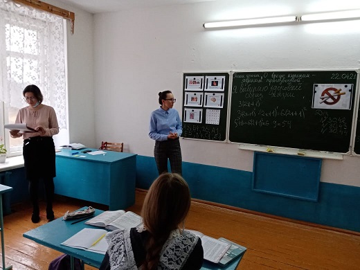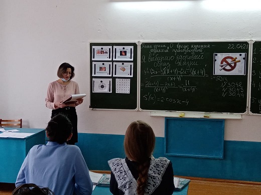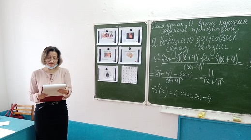 В рамках недели здорового питания и декады естественных наук 22 апреля 2021 г. в 10 классе учителем математики был проведен урок алгебры на тему "О вреде курения языком производной". Устный опрос учащихся с актуализацией имеющихся знаний учащихся по теме привел к девизу урока: "Я выбираю здоровый образ жизни!" Открывая "мишени", прилепленные к доске, дети получали задания. А, решив задания, открывали иллюстрации с изображением отдельных органов человека, на которые влияет курение. Решение каждого примера завершалось ознакомлением с информацией о том, какое влияние оказывает курение на тот или иной человеческий орган.